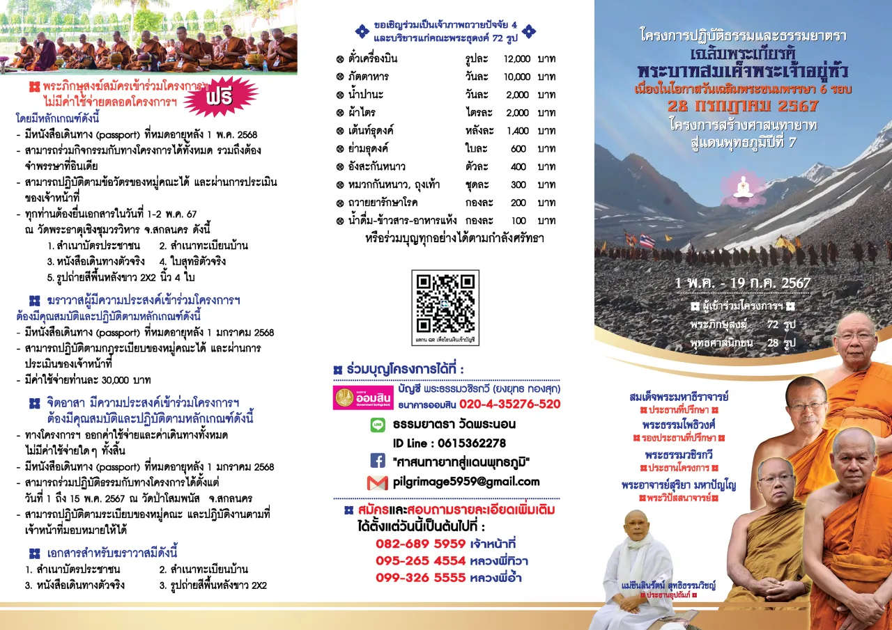 เจ้าภาพตั๋วเครื่องบิน รูปละ ๑๒,๐๐๐ บาท เจ้าภาพภัตตาหาร วันละ ๑๐,๐๐๐ บาท เจ้าภาพน้ำปานะ วันละ ๒,๐๐๐ บาท เจ้าภาพผ้าไตร ไตรละ ๒,๐๐๐ บาท เจ้าภาพเต้นท์ธุดงค์ หลังละ ๑,๔๐๐ บาท เจ้าภาพย่ามธุดงค์ ใบละ ๖๐๐ บาท เจ้าภาพอังสะกันหนาว ตัวละ ๔๐๐ บาท เจ้าภาพหมวกกันหนาว,ถุงเท้า ชุดละ ๓๐๐ บาท เจ้าภาพถวายยารักษาโรค กองละ ๒๐๐ บาท เจ้าภาพน้ำดื่ม - ข้าวสาร- อาหารแห้ง กองละ ๑๐๐ บาท หรือร่วมทุกอย่างได้ตามกำลังศรัทธา